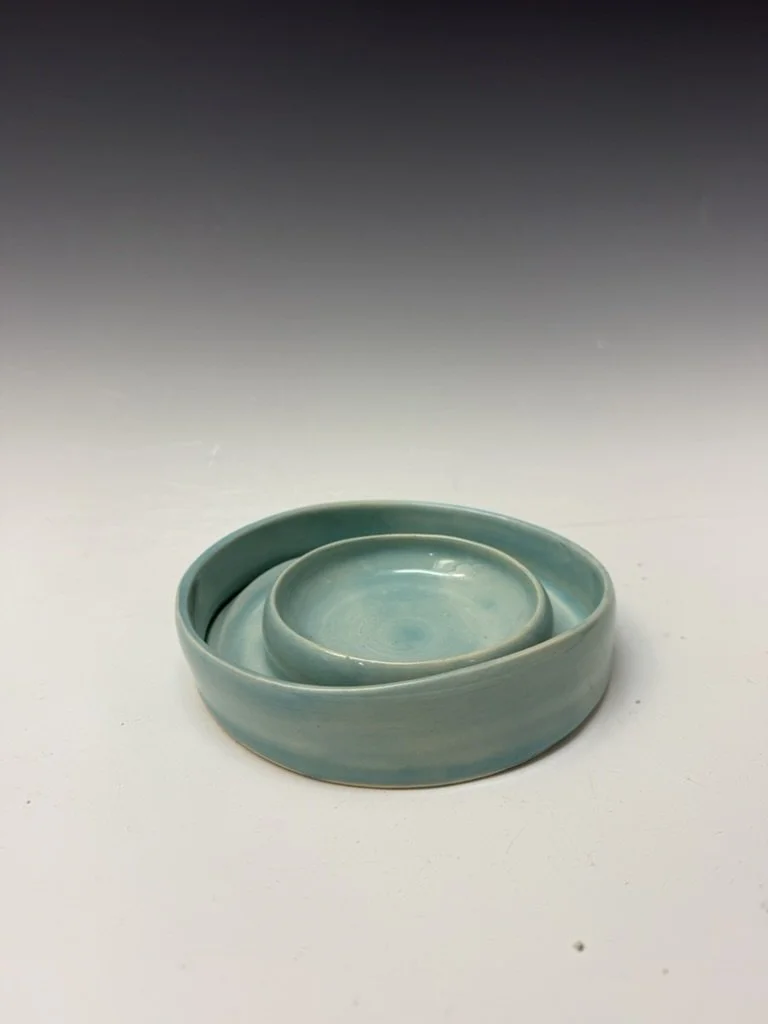 Bowls thrown on the electric wheel. This year I have finally been able to begin to master throwing and found I prefer the electric wheel to be much easier than the kick wheel. I’ve gotten really into experimenting with glazes as well trying lots of different combos. My favorite glaze so far is slate green because I love the way the oxide creates a pretty green and black contrast. I also love doing a combo with floating blue and espresso.